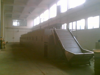 物料由加料器(或手工操作)均匀地铺在网带上,网带一般采用12~16目的不锈钢丝网(也可根据物料不同选择不同的网带、钢带),由转动装置拖动在干燥机内移动。干燥机由若干单元组成,每一单元热风可独立循环,部分尾气由专门的排湿风机排出,废气排出量由调节阀控制。热气由下向上穿过铺满物料的网带,完成热量与质量的传递,带走物料水分,从而实现干燥过程。网带允许的速度可根据物料水份及温度要求调节,单元数量也可根据需要选取。